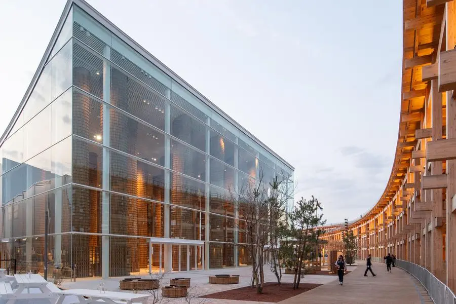 Under the theme Earth to Ether, the Pavilion brought together material, craft and storytelling, welcoming visitors into a spatial experience. Where the design centred on ninety palm-inspired rachis columns rising up to sixteen metres, forming a shaded canopy inspired by an oasis. Emirati building traditions were reinterpreted through precise wood craftsmanship developed in dialogue with Japanese expertise. Material innovations including Datecrete and Dateform reflected experimentation with local resources.