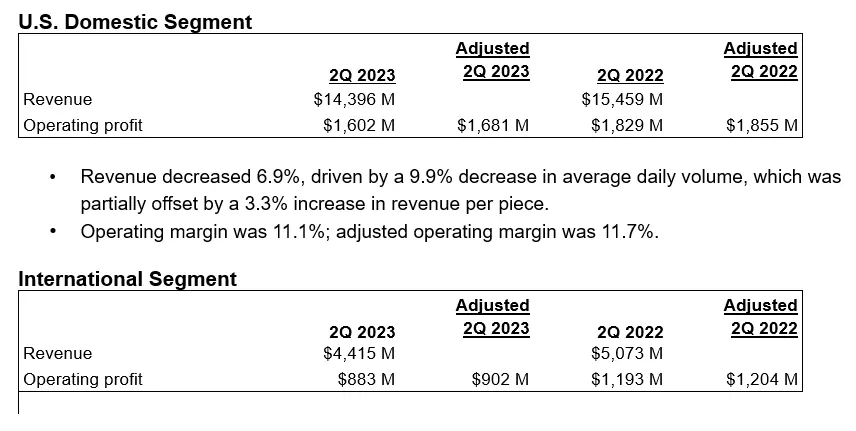 ATLANTA – August 8, 2023 – UPS (NYSE:UPS) today announced second-quarter 2023 consolidated revenues of $22.1 billion, a 10.9% decrease from the second quarter of 2022. Consolidated operating profit was $2.8 billion, down 21.4% compared to the second quarter of 2022, and down 18.4% on an adjusted basis. Diluted earnings per share were $2.42 for the quarter; adjusted diluted earnings per share of $2.54 were 22.8% below the same period in 2022.