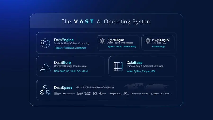 VAST Data is the AI Operating System company – powering the next generation of intelligent systems with a unified software infrastructure stack that was purpose-built to unlock the full potential of AI. The VAST AI OS consolidates foundational data and compute services and agentic execution into one scalable platform, enabling organizations to deploy and facilitate communication between AI agents, reason over real-time data, and automate complex workflows at global scale. Built on VAST’s breakthrough DASE architecture – the world’s first true parallel distributed system architecture that eliminates tradeoffs between performance, scale, simplicity, and resilience – VAST has transformed its modern infrastructure into a global fabric for reasoning AI. Learn more at vastdata.com and follow VAST Data on LinkedIn, YouTube and X.
