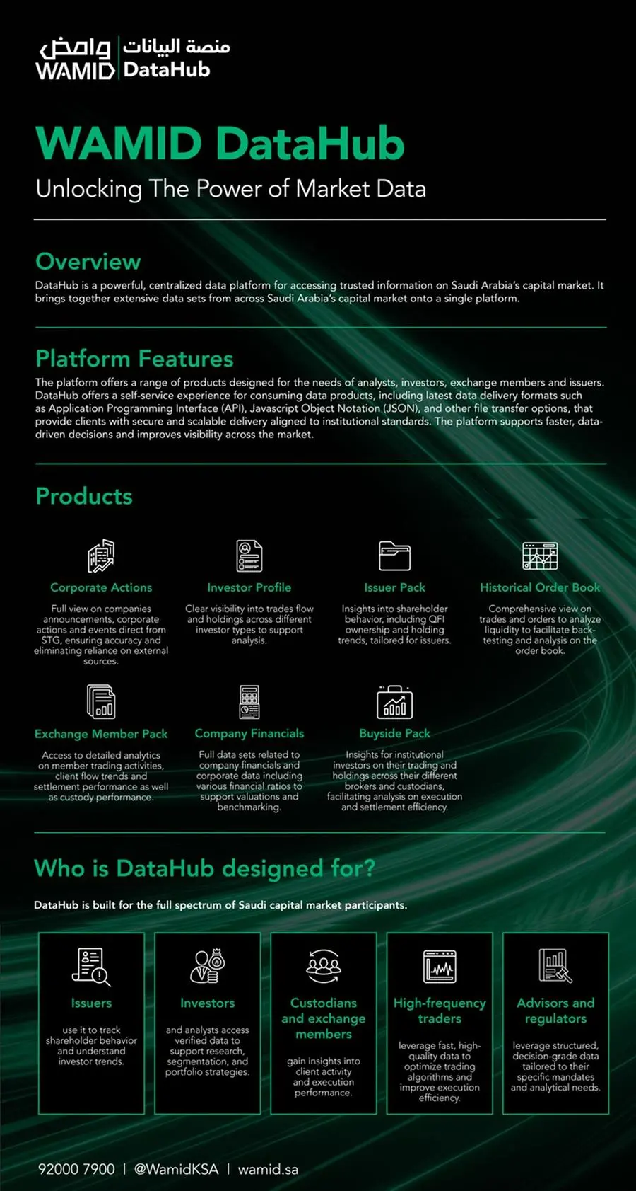 Yazeed Al Domaiji, Chief Executive Officer of WAMID, said: “DataHub is a key initiative for the Saudi capital market that will enable market participants to integrate data from a trusted source into their workflows to make smarter and faster decisions. This innovative platform intensifies our focus on innovation, technology, and expanding access to data, and underscores our commitment to driving transparency, efficiency and growth across the Saudi capital market.”