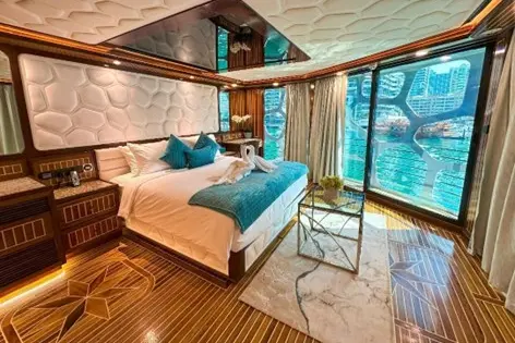 Prices start from AED 990 per night per room. This SuperYacht is also available for private hire—ideal for corporate gatherings, private celebrations, or full buyouts of all 31 rooms and suites.