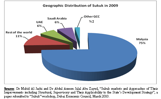 In 2007, UAE was on the top of countries that issued sukuk. The value of sukuk reach $33b compared to Malaysia $31 b. The UAE retains its leading position in 2008. However, the issuance volume has been decreased in 2008, then dropped in 2009. According to the updated statistics, Malysia captured the largest share of global sukuk market (75%). UAE and Saudi Arabia each (6%), Other GCC state members (2%). Thus, the entire GCC members dominate about (14%) of global sukuk market in 2009.