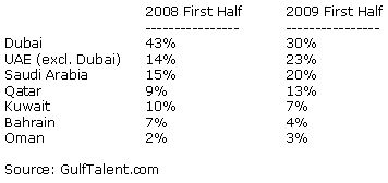 The research shows that the percentage of Dubai-based vacancies advertised on the firm's website constituted only 30% of all GCC-based positions advertised in the first half of the year, compared with 43% over the same period in the previous year. Kuwait and Bahrain have also been badly hit.