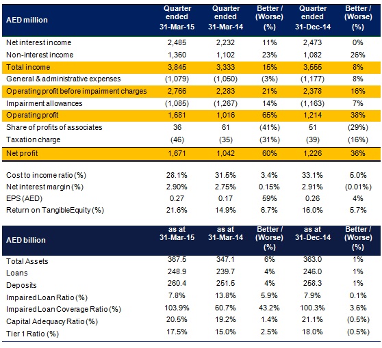 Net profit for the Group was AED 1,671 million in Q1-15, 60% above the profit posted in Q1-14. The increase in net profits was driven by growth in both net interest income & non-interest income, stable expenses and reduced provisions.