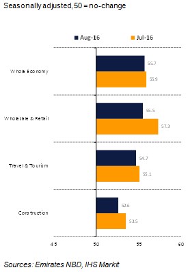 Dubai, September 8, 2016: August data signalled a further strong upturn in business activity across the Dubai private sector economy, with the latest improvement only slightly less marked than the 16-month peak seen in July. At 55.7 in August, the seasonally adjusted Emirates NBD Dubai Economy Tracker Index was down fractionally from 55.9 in July but above the 50.0 no-change threshold for the sixth successive month. Moreover, the headline index - a composite indicator designed to give an accurate overview of operating conditions in the non-oil private sector economy - is on track for its highest average reading for any quarter since the start of 2015.