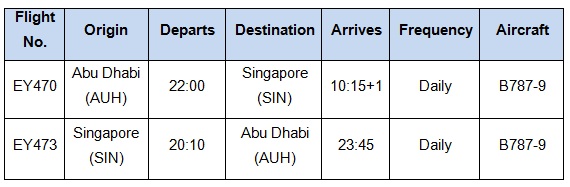 Flight EY470 departed Abu Dhabi at 10pm last night and touched down at Singapore's Changi Airport at 10.15am today. The return flight EY473 will depart Changi Airport for Abu Dhabi at 8.10pm this evening and arrive in the UAE capital at 11.45pm local time.