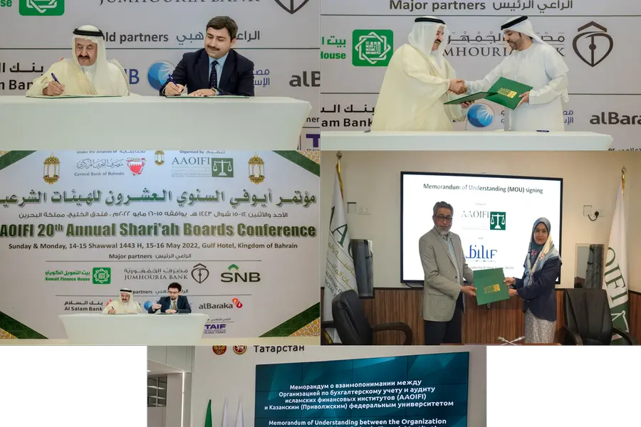 Accounting and Auditing Organization for Islamic Financial Institutions (AAOIFI) signed memoranda of understanding (MOUs) and AAOIFI membership agreements on the side-lines of its 20th Shari'ah Boards Conference. The MOUs signed at the conference held on 14-15 Shawwal 1443 H corresponding to 15-16 May 2022 at Gulf Hotel in the Kingdom of Bahrain, aim to initiate collaboration on areas of mutual interest to promote Islamic banking and finance industry. The agreements also aim to strengthen mutual ties not only between the institutions but also to cater to the growing need and interest to develop Islamic finance industry in their respective jurisdictions.