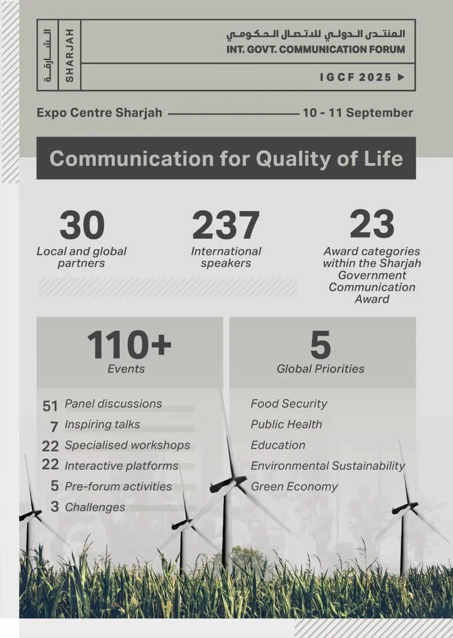 Sharjah: The International Government Communication Forum (IGCF) 2025 has announced a dedicated programme on food security, to be held on 10–11 September at Expo Centre Sharjah under the theme “Communication for Quality of Life.”