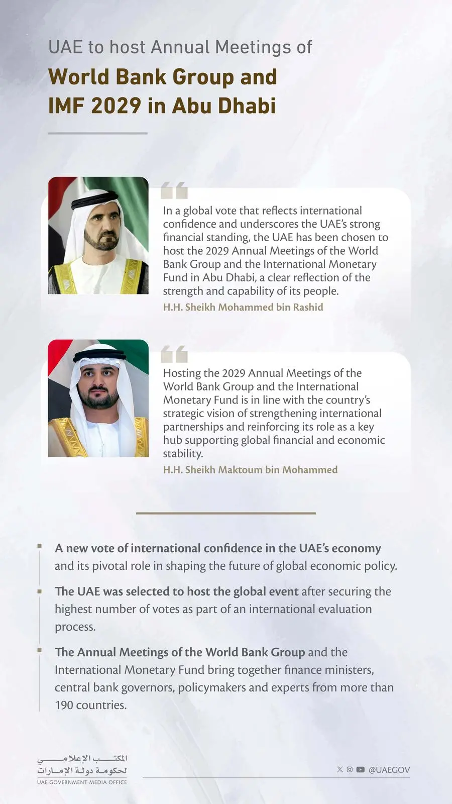 His Highness Sheikh Mohammed bin Rashid Al Maktoum, Vice President, Prime Minister and Ruler of Dubai said: “In a global vote that reflects international confidence and underscores the UAE’s strong financial standing, the United Arab Emirates has been chosen to host the 2029 Annual Meetings of the World Bank Group and the International Monetary Fund in Abu Dhabi, a clear reflection of the strength and capability of its people.”