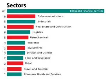 Following a wave of mergers and acquisitions across the region, banks and financial services take the largest share in terms of sector. The industrial sector and telecommunications came in second and third with Etisalat (#5) being the biggest telecommunications company across all metrics and Industries Qatar (#31) as the biggest industrial company in the list.