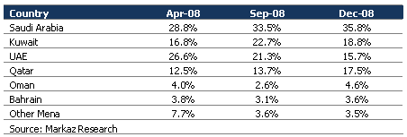 Within equities, exposure to Saudi Arabia and Qatar increased at the expense of Kuwait and UAE There was a slight increase in allocation to Saudi Arabia, from 33.5% in September to nearly 36% in December; the increase is more notable when viewed from April 2008 when allocation to Saudi was at 28.8%. Exposure to the Kuwait market fell markedly from 22.7% in September to 18.8% in December. The decreased confidence was even more apparent in the UAE, where allocation dropped from 26.6% in April 2008 to 15.7% in December.