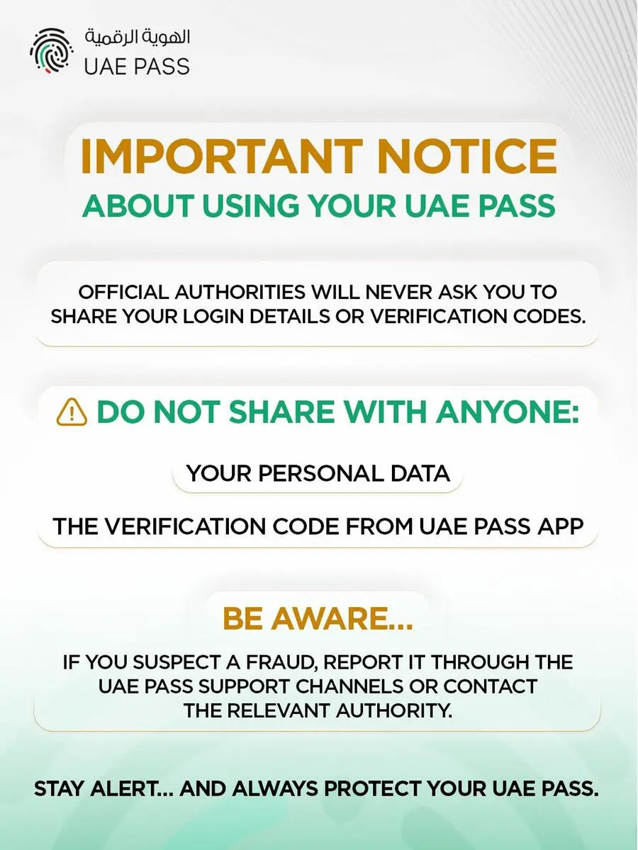 They also encouraged the public to maintain high level of digital awareness to protect personal data and accounts, emphasizing that continuous vigilance is essential to safeguarding UAE PASS security and the integrity of digital services.