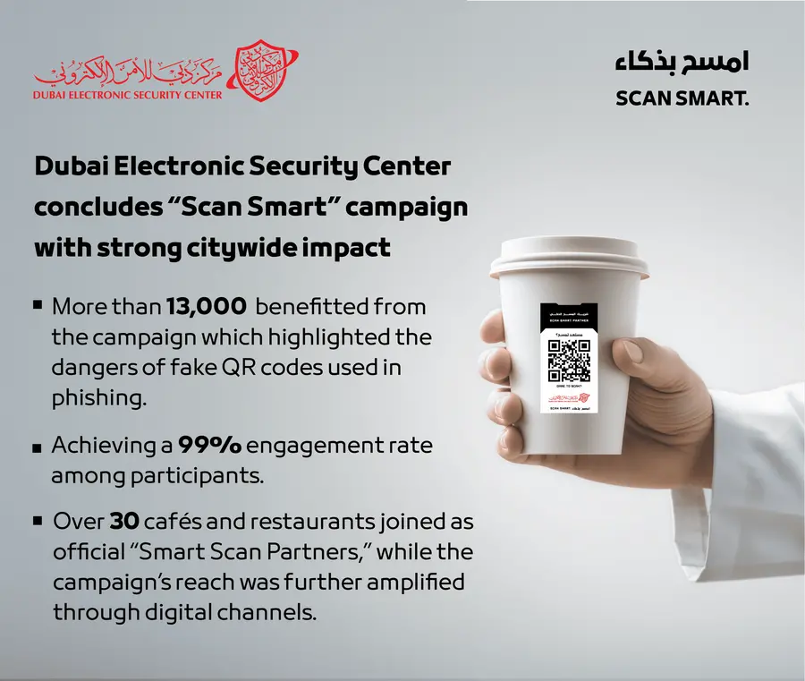 Dubai, UAE: Dubai Electronic Security Center (DESC) successfully concluded “Scan Smart” awareness campaign, a public cybersecurity drive launched during Cybersecurity Awareness Month to promote safe QR code practices across Dubai. The effort generated significant traction among residents, visitors, and businesses, reinforcing Dubai’s commitment to creating a secure and digitally resilient society. The initiative empowered the public to recognize and avoid fraudulent QR codes which are increasingly used in digital scams, and fostered a culture of smart, conscious interaction with modern technology.
