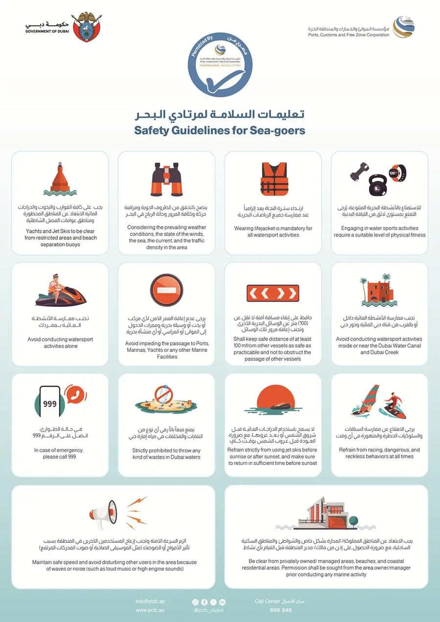 This comes under a circular issued by the Dubai Maritime Authority to companies that provide recreational maritime activity services to customers, requiring compliance through clearly displaying the permit issued by the Dubai Maritime Authority (Ports, Customs and Free Zone Corporation), which includes key maritime safety guidelines to be followed during such activities. The circular obliges companies to display, clarify, and present these guidelines so users and participants can review them.