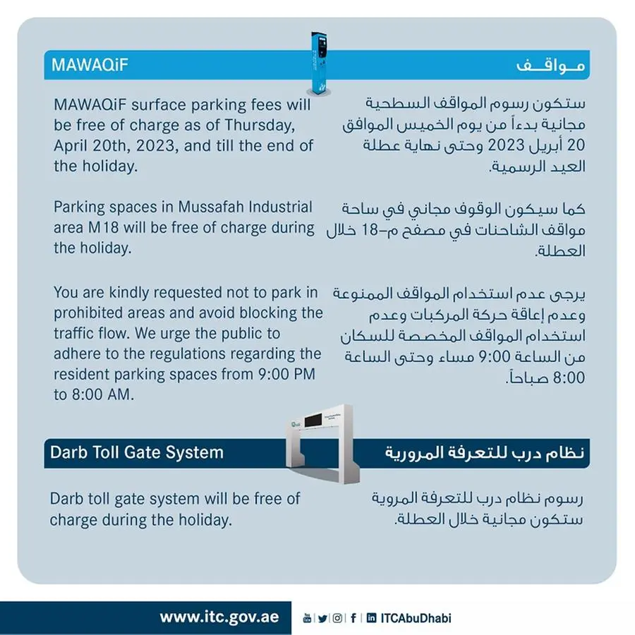 MAWAQiF surface parking fees will be free of charge as of Thursday, April 20th, 2023, and till the end of the holiday. In addition, parking fees at the Musaffah M-18 truck parking lot will also be free of charge during the Eid holiday.