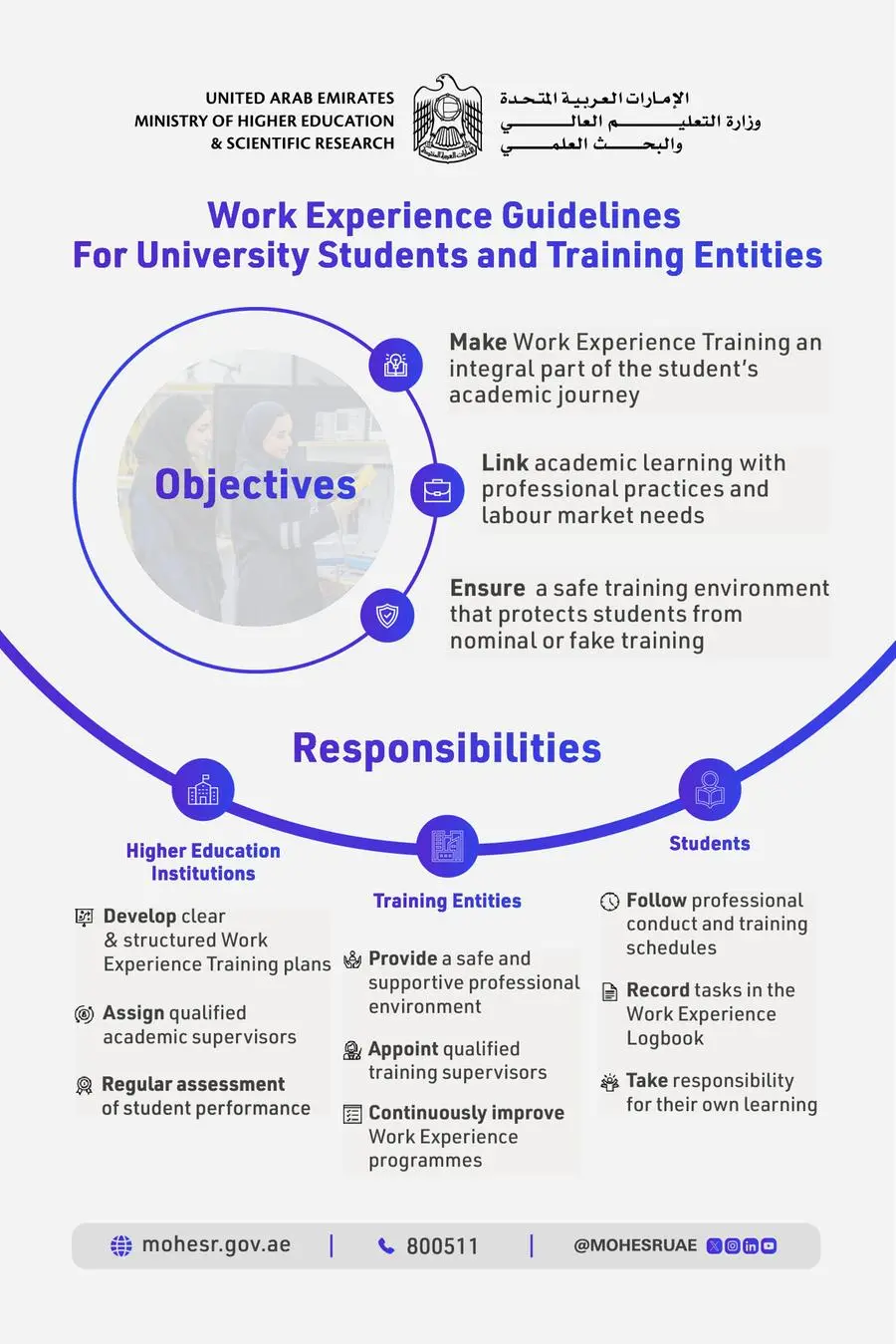 United Arab Emirates: The Ministry of Higher Education and Scientific Research (MoHESR) has issued the Guide for Governance of Work Experience for Students in Higher Education Institutions (HEIs), including universities and vocational training institutions. The guide ensures that work experience – previously known as practical training – becomes a core part of students’ academic journey, bridging theory and practice to prepare students for the labour market while preventing improper work experience practices.