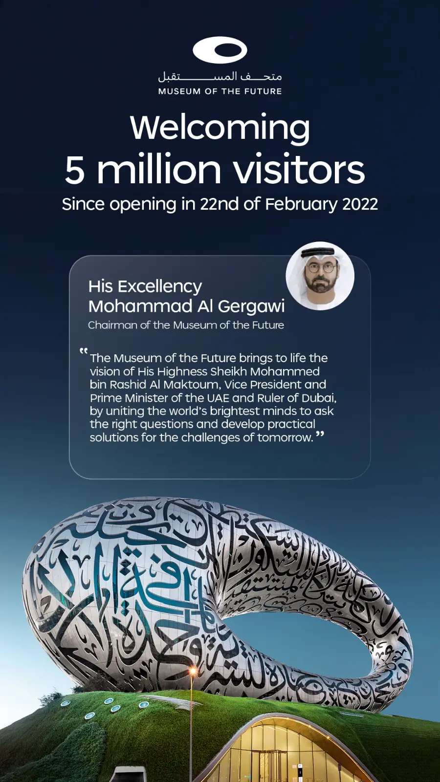 - Mohammad Al Gergawi: The Museum of the Future embodies the vision of Mohammed bin Rashid to bring together the world’s brightest minds to ask the right questions and develop practical solutions for the challenges of tomorrow