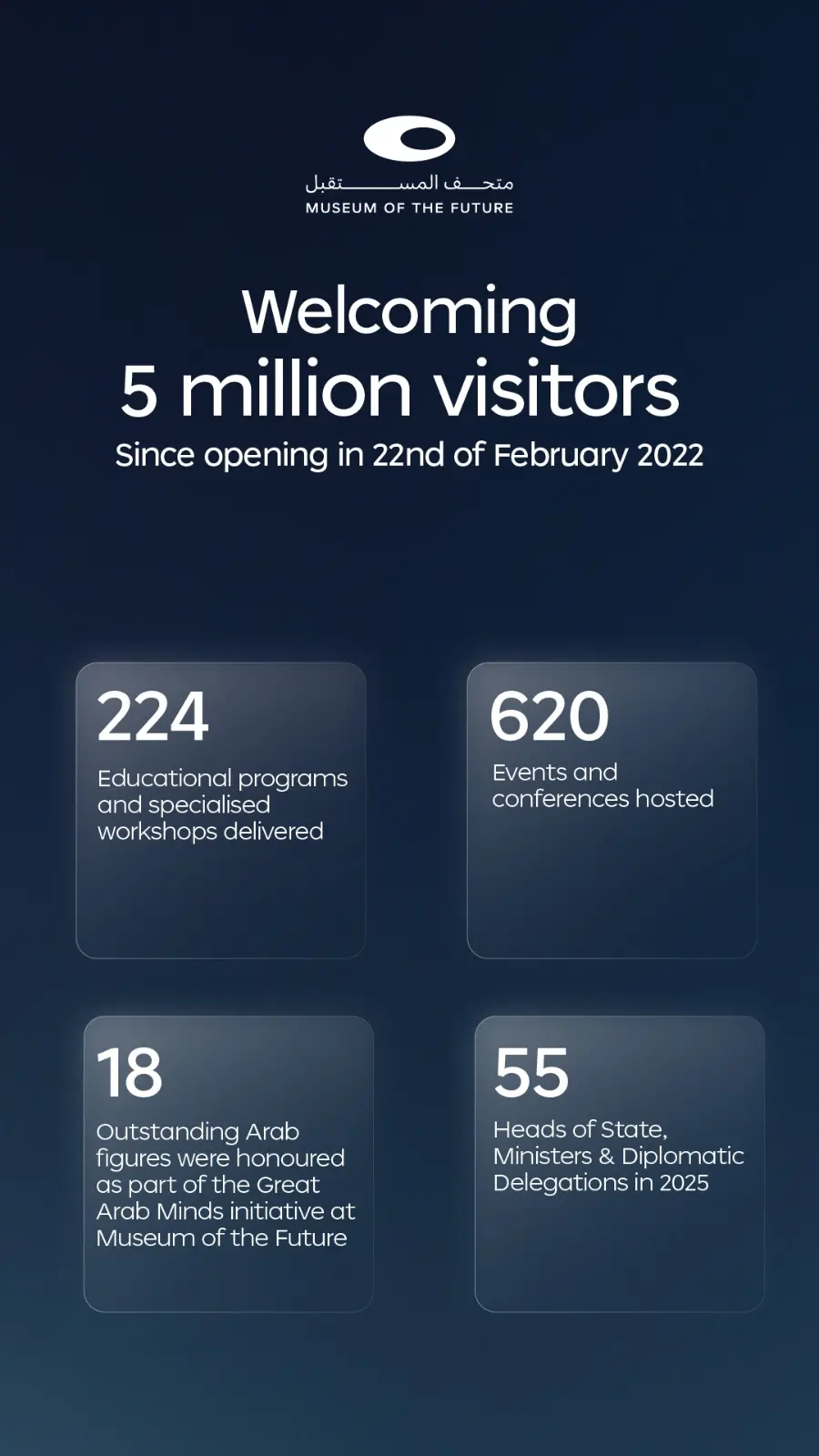 This milestone reflects a journey that began with the idea on the sidelines of the World Governments Summit, followed by the project announcement on 3 March 2015, the issuance of Law No. 19 of 2015 establishing the Museum, and its global opening in 2022. Today, the Museum stands as one of the most visited destinations and one of the fastest-growing institutions in the global knowledge community.