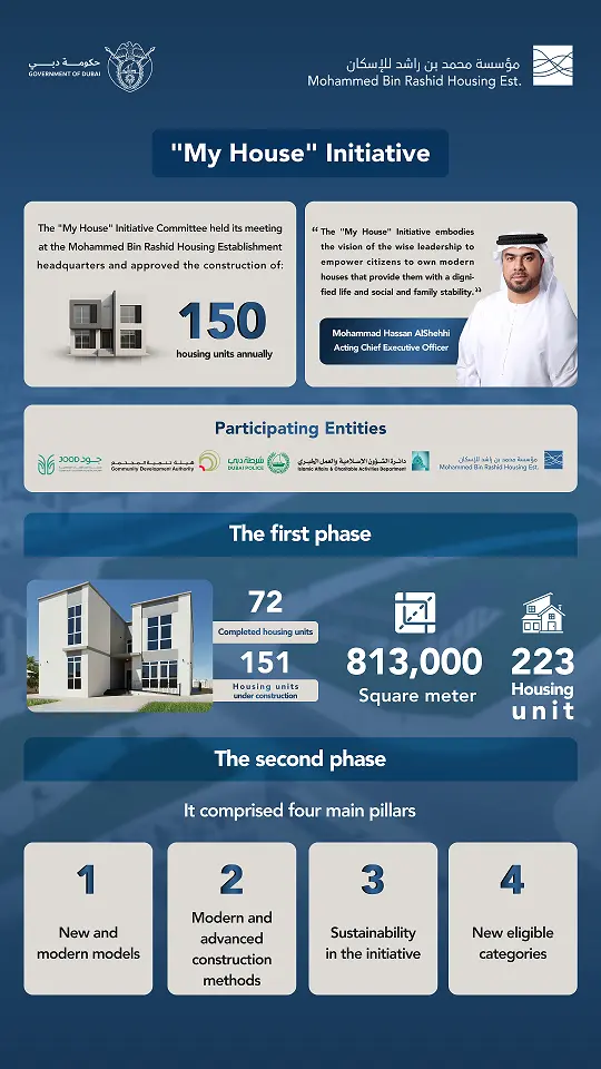 His Excellency Mohammed Al Shehhi stated that the “My House” initiative reflects the vision of the wise leadership to empower citizens to own modern house that ensure a dignified life and family and social stability, noting that it represents a model of integration between government and private sector entities.