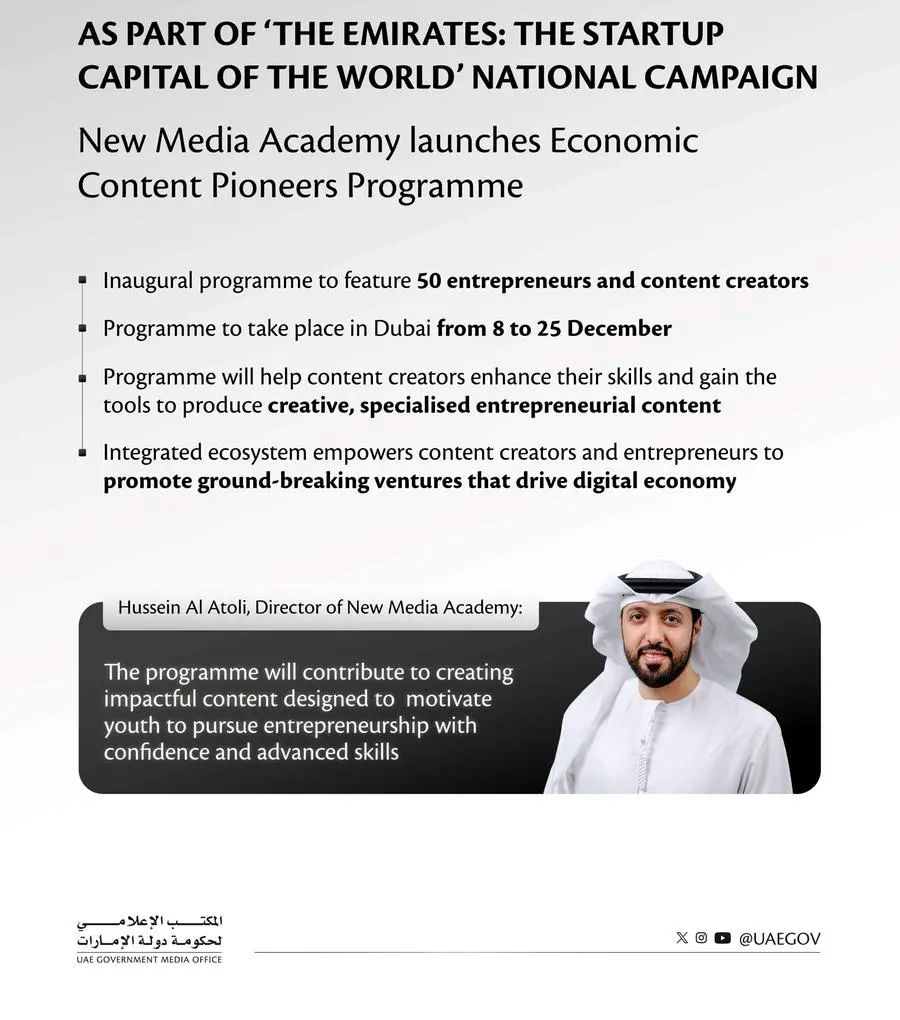 UAE – The New Media Academy, the Middle East's innovative and first of its kind in the field of digital media, launched the Economic Content Pioneers Programme as part of ‘The Emirates: The Startup Capital of the World’ national campaign, launched by His Highness Sheikh Mohammed bin Rashid Al Maktoum, Vice President and Prime Minister of the UAE and Ruler of Dubai, to strengthen the UAE’s position as a leading global hub for entrepreneurship.