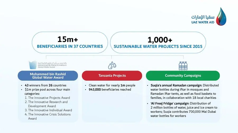 Dubai, UAE: Under the umbrella of the Mohammed bin Rashid Al Maktoum Global Initiatives, the largest humanitarian and aid organisation of its kind in the region, the UAE Water Aid Foundation (Suqia) continues to amplify the country's humanitarian impact around the world. Driven by a mission to improve the lives of millions, Suqia stands at the forefront of efforts to ease the hardships of communities most affected by the global water crisis through innovative sustainable solutions. Suqia has collaborated with key partners at home and abroad to deliver more than 1,000 sustainable water projects since its founding in 2015, improving the lives of about 15 million people across 37 countries.