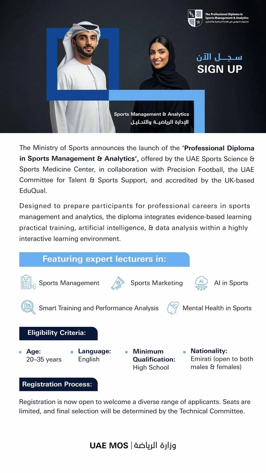 The Professional Diploma in Sports Management and Analytics runs over eight weeks, with three weekly sessions combining lectures with hands-on training, interactive workshops and the graduation project. It is open to Emirati youth of both genders, aged 20-35, who hold a high school diploma and are proficient in English.