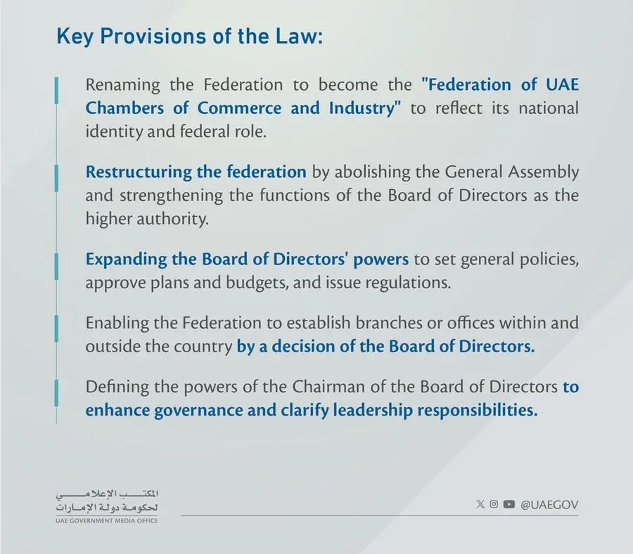 In support of enhanced governance and clear leadership responsibilities, the Decree-Law introduces a new article defining the powers of the Chairman of the Board of Directors of the Emirates Union of Chambers of Commerce and Industry.