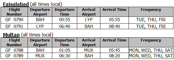 Gulf Air, the Kingdom of Bahrain's national carrier, is adding two new destinations in Pakistan to its network with the addition of direct services to the cities of Faisalabad and Multan scheduled for launch in December 2015. The airline will begin four weekly direct flights to Multan and will commence three weekly services to Faisalabad.