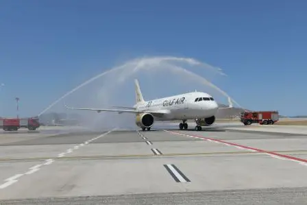 Manama, Kingdom of Bahrain: Gulf Air, the national carrier of the Kingdom of Bahrain, celebrated the beginning of its seasonal destinations for the summer with the inaugural flight to Mykonos in Greece as flight GF036 was welcomed into Mykonos International Airport with a water cannon salute and, upon arrival, a number of airport officials joined the airline’s flying crew for commemorative photographs. Before departing from Bahrain International Airport, passengers were handed special boarding passes and commemorative certificates in celebration of the airline’s very first flight from the Kingdom of Bahrain to the Greek island of Mykonos. The flight was operated by Gulf Air’s new aircraft the Airbus A320neo which features 16 Falcon Gold seats and 120 economy class seats.