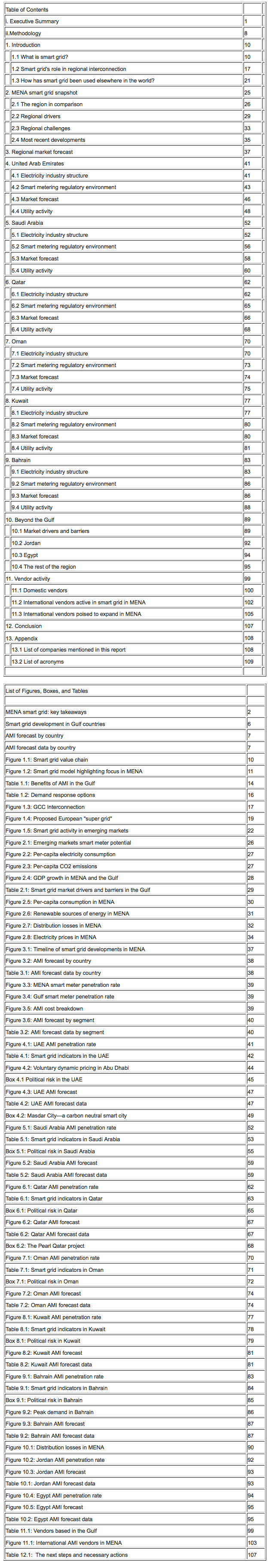 Northeast Group forecasts 5 segments of the smart meter - or advanced metering infrastructure (AMI) - market, including meter hardware, communications, IT, professional services, and installation services for 12 countries across the MENA region. In addition to smart meter market forecasts, the report covers distribution automation activity, wide area measurement initiatives and home energy management. The report also highlights the positioning of domestic and international smart grid vendors in the region. Countries profiled in the study include: