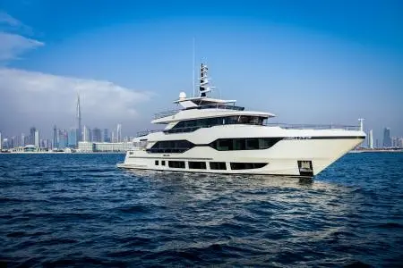 The 120 feet (nearly 37 metres) long composite production superyacht with a beam of 26.6 ft (8.1 metres) is made of lightweight yet sturdy carbon fibre and vinyl ester. It was fully manufactured at Gulf Craft’s integrated in-house production facility in Umm Al Quwain.