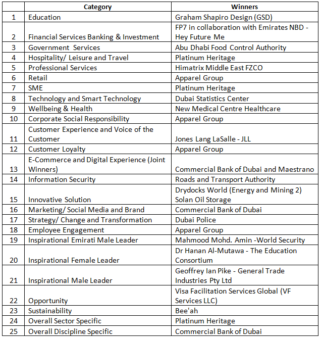 Altogether there were 23 category award winners with Apparel Group being the big winners on the day, taking home four Awards. Platinum Heritage and Commercial Bank of Dubaiwon the coveted Overall Sector Specific and Overall Discipline Categories respectively.
