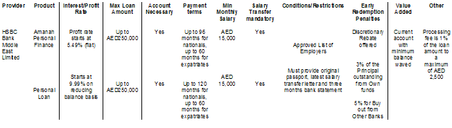 The 12 month loan is available to customers with a minimum monthly salary of AED15,000/- who hold an account with the bank. Salary transfer to the customer's HSBC account is mandatory.