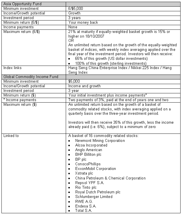 - More investment choice - for the first time in this fund series, investors can choose between an equity index linked fund and a fund linked to commodity related stocks.