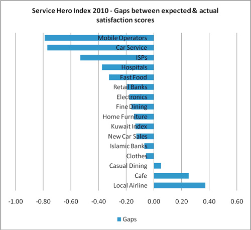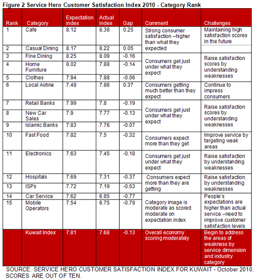 Kuwait December 4, 2010: Service Hero's 2010 Customer Satisfaction Index for Kuwait that was surveyed in October with a wide sample population of 8,700 votes in Kuwait showed for the first time the strengths challenges of Kuwait's leading service-based industries as identified by Kuwait's consumers.
