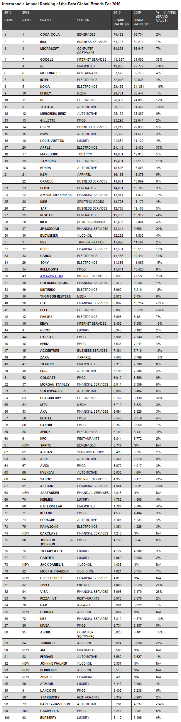 Dubai, UAE, September 16, 2010 -- Interbrand, the leading brand consultancy today published its annual ranking of the top 100 brands for 2010. The ranking is developed using a unique methodology which analyses the many ways a brand impacts and benefits the organization. For the 11th year straight, Coca-Cola (#1) retains its top spot as the number one ranked brand on the list, boasting a brand equity value of $70,452m.