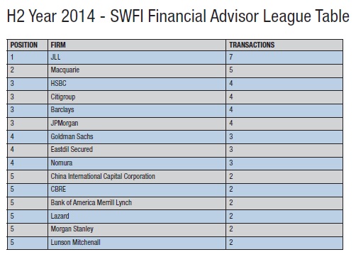 Arthur de Haast, Lead Director, International Capital Group, JLL said: "Topping the SWFI league table for second half of 2014 is great testament to the hard work of JLL's capital markets teams globally on behalf of clients. A key priority for us is to operate as one integrated team across borders, providing clients with a seamless service globally."