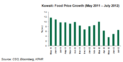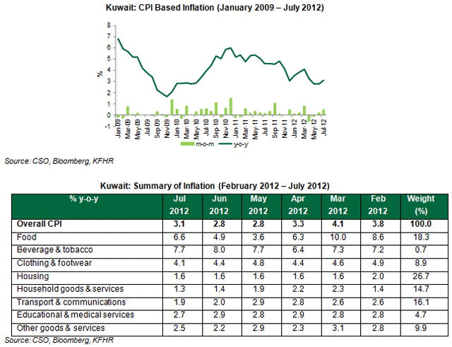 Kuwait's consumer price index (CPI) based inflation inched up to 3.1% y-o-y in July 2012 from 2.8% y-o-y in June 2012 as food prices (the second largest contributor of Kuwait's CPI basket at 18.3%) rose to 6.6% y-o-y in July 2012 from 4.9% y-o-y in June 2012. On a monthly basis, the overall inflation rose to 0.5% in July 2012 from 0.2% in June 2012.