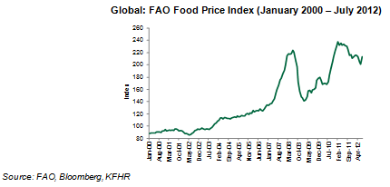 The FAO Food Price Index rose to 213.2 points in July 2012, as much as 13 points (6.0% m-o-m) up from 200.8 points in June 2012. The July 2012 surge of the Index followed three months of decline. The sharp rebound was mostly driven by a jump in grain and sugar prices. The severe deterioration of maize crop prospects in the US, following drought conditions and excessive heat during critical stages of the crop development, pushed up maize prices by almost 23.0% m-o-m in July 2012. Meanwhile, the rise in sugar price was triggered by untimely rains in Brazil, the world's largest sugar exporter, which hampered sugarcane harvesting in July 2012.