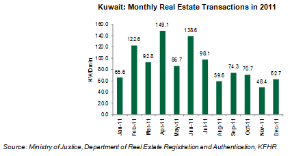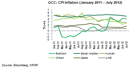 On the other hand, housing segment prices (the largest component of Kuwait's CPI basket) remained unchanged at 1.6% y-o-y in July 2012 (June 2012: 1.6% y-o-y). Nonetheless, a strong recovery of the real estate sector in Kuwait is anticipated to continue given the latest transaction volumes recorded at KWD318.1mln, KWD255.0mln and KWD246.0mln in January, February and March 2012.In general, real estate transactions continue to be supported by strong demands for residential and investment properties, but are somewhat being affected by a sluggish commercial real estate sector. The improved confidence and sentiment in the real estate market are supported by regulatory tightening and the government's spending plans. The KWD37.0bn Kuwait Development Plan (KDP) is expected to stimulate growth in the residential sector, while the Kuwait Investment Authority (KIA) plans to invest KWD1.0bln in the investment and commercial real estate sectors. Consequently, we opine that the real estate market in Kuwait especially for residential real estate would remain bullish for the remaining of 2012.