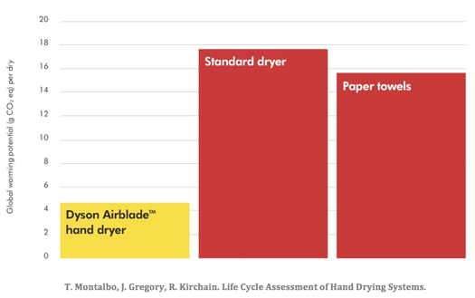 Unlike paper towels - the most resource intensive hand drying method - the environmental impact of warm air hand dryers (and most home appliances) occurs during use. Energy-hungry heating elements and inefficient motors tip the sustainability scales, making warm air dryers up to 80% less energy efficient than the Dyson Airblade™ hand dryer.