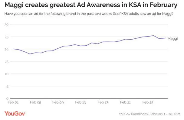 Maggi, the international food brand particularly known for its seasonings and instant soups, saw the highest increase in Ad Awareness in Saudi Arabia this February. This comes as no surprise given that Maggi has recently launched its, “cook the difference with Maggi” campaign, showcasing and promoting easy, fast, and delicious recipes to cook at home using Maggi ingredients. The ads include appealing pictures of homemade recipes, directing viewers to Maggi’s KSA website to see more. In addition, Maggi also launched a new range of cooking pastes in February and the digital content promoting these already have over 1 million views on YouTube.