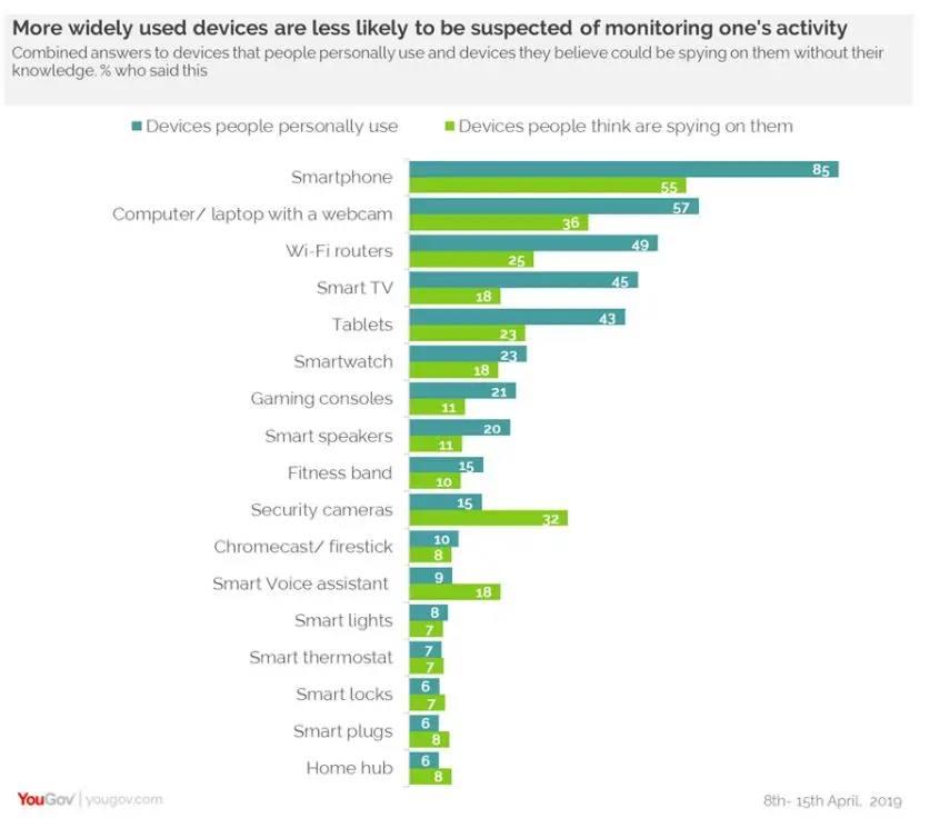 YouGov’s data finds that the most commonly owned devices are also the ones people are most likely to think are monitoring them. While 85% of people own a smartphone, 55% believe the technology is spying on them. Similarly, when it comes to a computer/laptop with a webcam, the figures are 57% (who use) and 36% (who think it is spying on them), respectively.