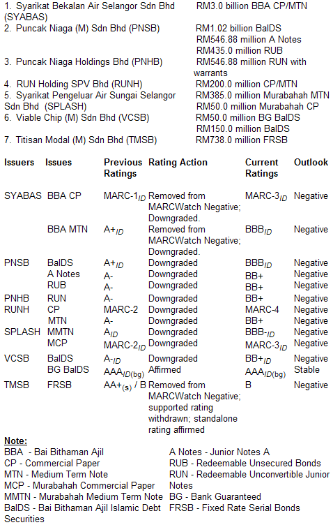 MARC today took various rating actions on the Selangor water sector issuers. Below is a list of all the affected debt issuances and rating actions: