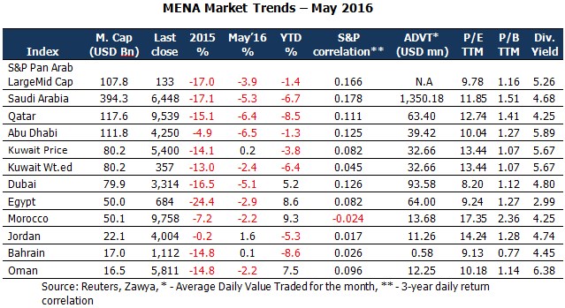 May was a negative month for MENA indices, barring Jordan, as investors continued to book profits in the absence of positive cues, and fund managers proved cautious over Fed rate hike speculation. Jordan (1.6%) was the lone survivor, followed by Kuwait Price (0.2%) and Bahrain (0.1%), while Kuwait weighted index declined 2.4%, because of selling pressures in the Financial Services and Telecommunications sectors. Abu Dhabi (6.5%), Qatar (6.4%), Saudi Arabia (5.3%) and Dubai (5.1%) fell in May, marking it as the worst month since January this year. Brent crude continued to climb in May, closing at USD 49.69 per barrel, after surpassing USD 50 per barrel in the month; the first time since Nov'15.