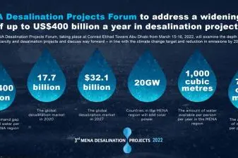 The 3rd MENA Desalination Projects Forum that takes place from March 15-16, 2022 at the Conrad Abu Dhabi Etihad Towers, UAE, is the largest government-endorsed regional desalination conference. It will bring together over 400 regional and international stakeholders from the government, consulting, contracting and technology sectors to discuss the way forward for the region’s desalination industry, key upcoming mega projects, and national sustainability visions driving the region’s 2030 water agendas.