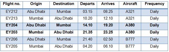 Etihad Airways' daily schedule between Abu Dhabi & Mumbai with the A380 flights highlighted: (all times are local)