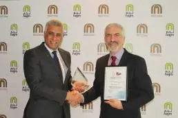 Chief Executive Officer of Najm, Rasool Hujair, accepts product award “2017 Best Credit Card” for its Voyager Credit Card program from Banker Middle East’s Chief Executive Officer, Robin Amlôt.