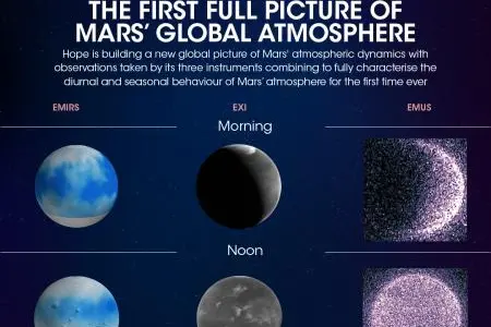 With key announcements already made including new and startling observations of Mars’ discrete aurora and unprecedented views of dayside oxygen and carbon monoxide structures in the planet’s atmosphere, new avenues of exploration are now being opened up by the slew of data being brought back from the Hope spacecraft. For the first time, Hope is building a full diurnal picture of Mars’ atmosphere.