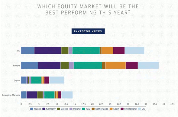 Europe is expected to be the best performing equity market in 2014, leading the way with 39% of investors' votes. However, other markets are also listed: 35% believe the US will be the strongest performing equity market; 15% say Emerging Markets will outperform other regions; and 12% believe Japan could perform the best.